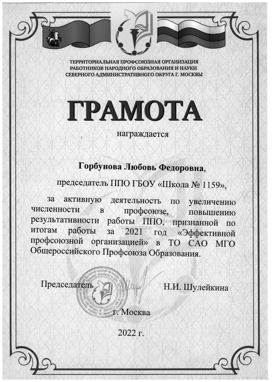 Радостной новостью стало то, что наша школа, в лице председателя Любови Федоровны Горбуновой, была награждена грамотой территориальной профсоюзной организации Северного Округа за активную деятельность по увеличению численности в профсоюзе, повышению результативности работы ППО, признанной по итогам работы за 2021 год "Эффективной профсоюзной организацией" в САО Общероссийского Профсоюза Образования.