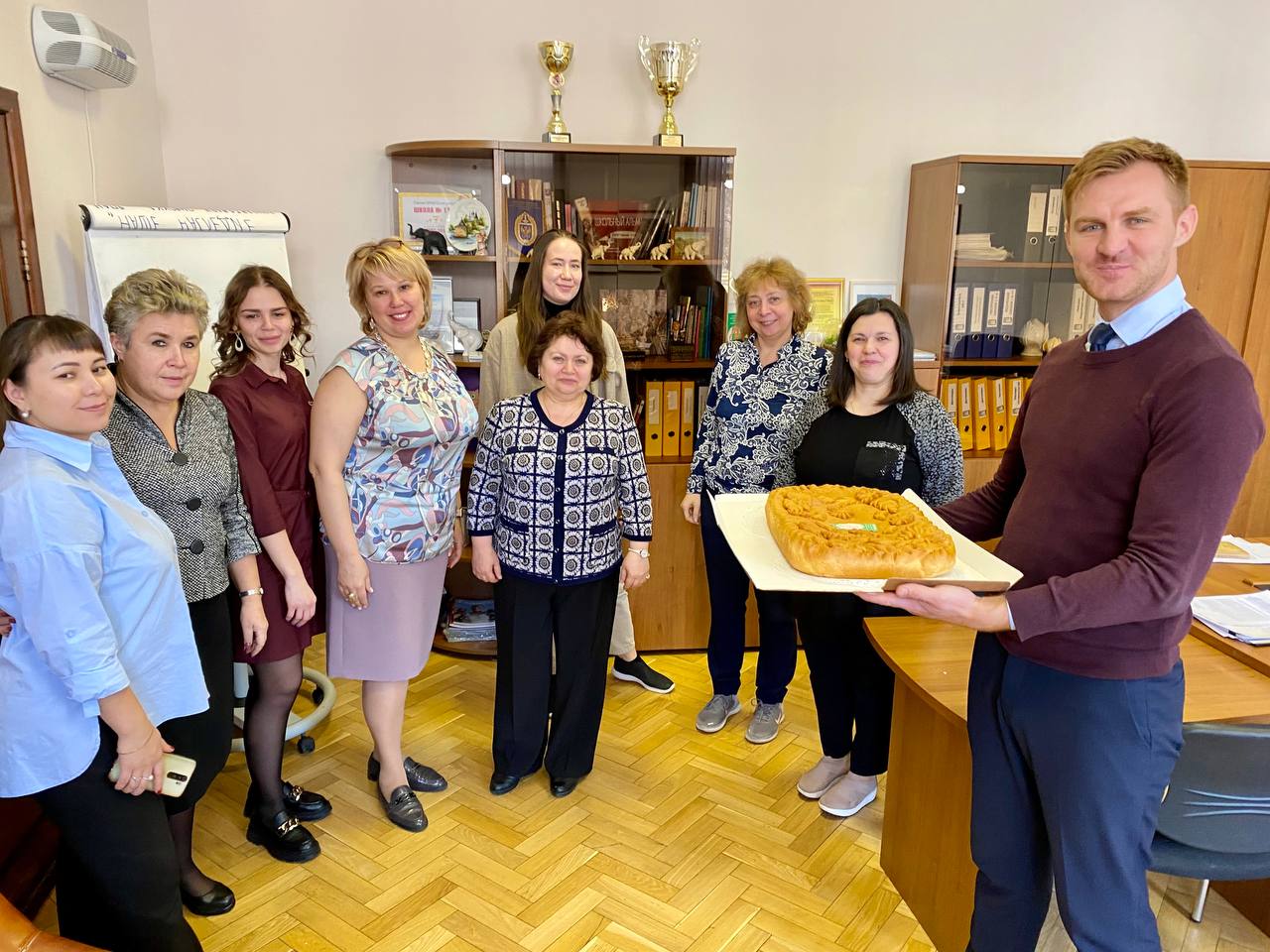 На фото коллектив Школы № 1159 дружно разрезает подаренный пирог. У нас есть повод! Наше учреждение - территория социального партнёрства.